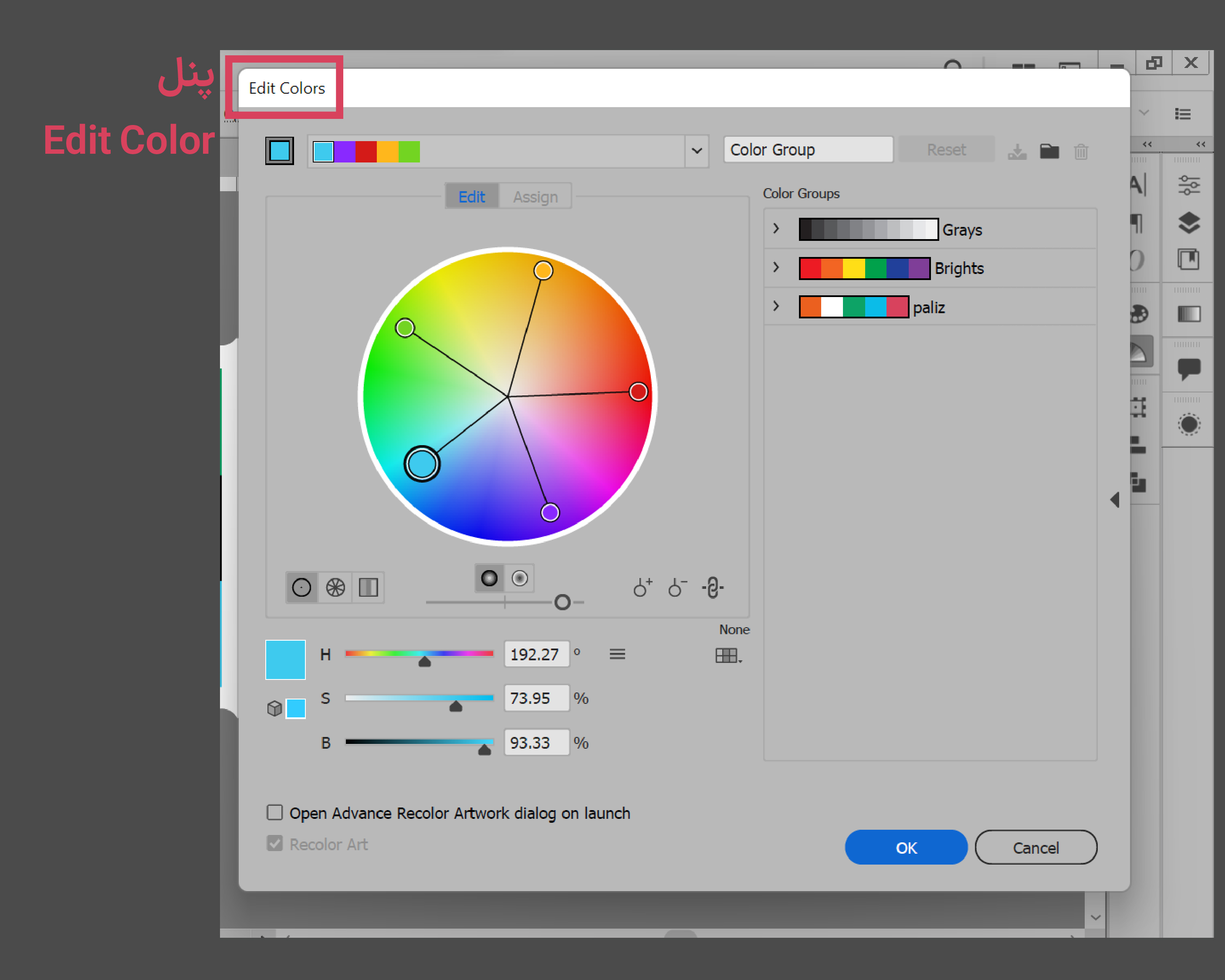 اوج قدرت این پنل وقتی دیده میشه که روی آیکون Edit or Apply Colors (شبیه یه چرخه رنگ) کلیک کنید. با این کار، پنجرهای باز میشه که یه دنیای کامل از امکانات رو در اختیارتون میذاره: