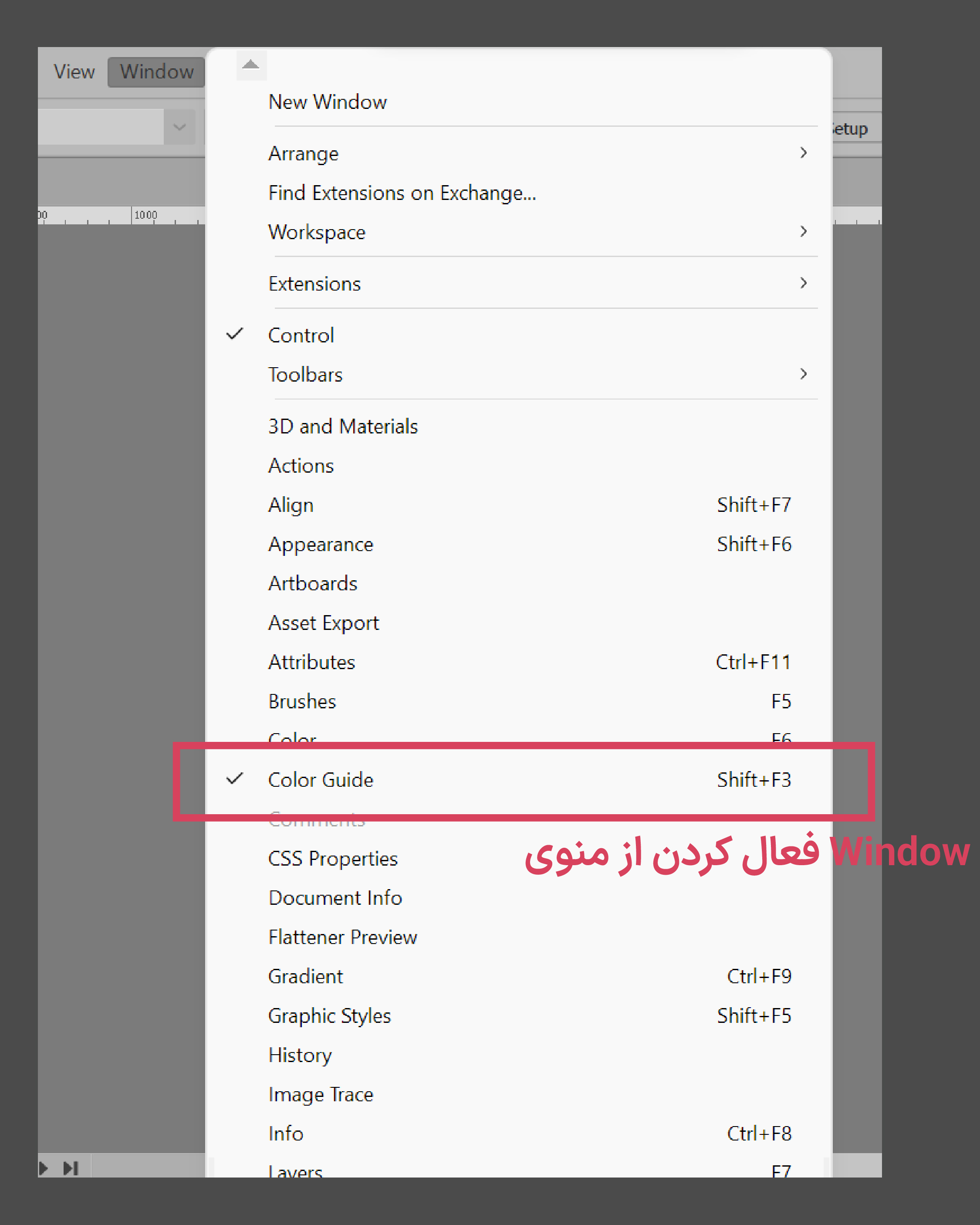 اگه این پنل رو تو محیط ایلاستریتور نمیبینید، خیلی راحت میتونید از منوی Window فعالش کنید. همچنین، به خاطر اهمیت بالایی که داره، ایلاستریتور یه کلید میانبر اختصاصی (Shift+F3) هم براش در نظر گرفته.