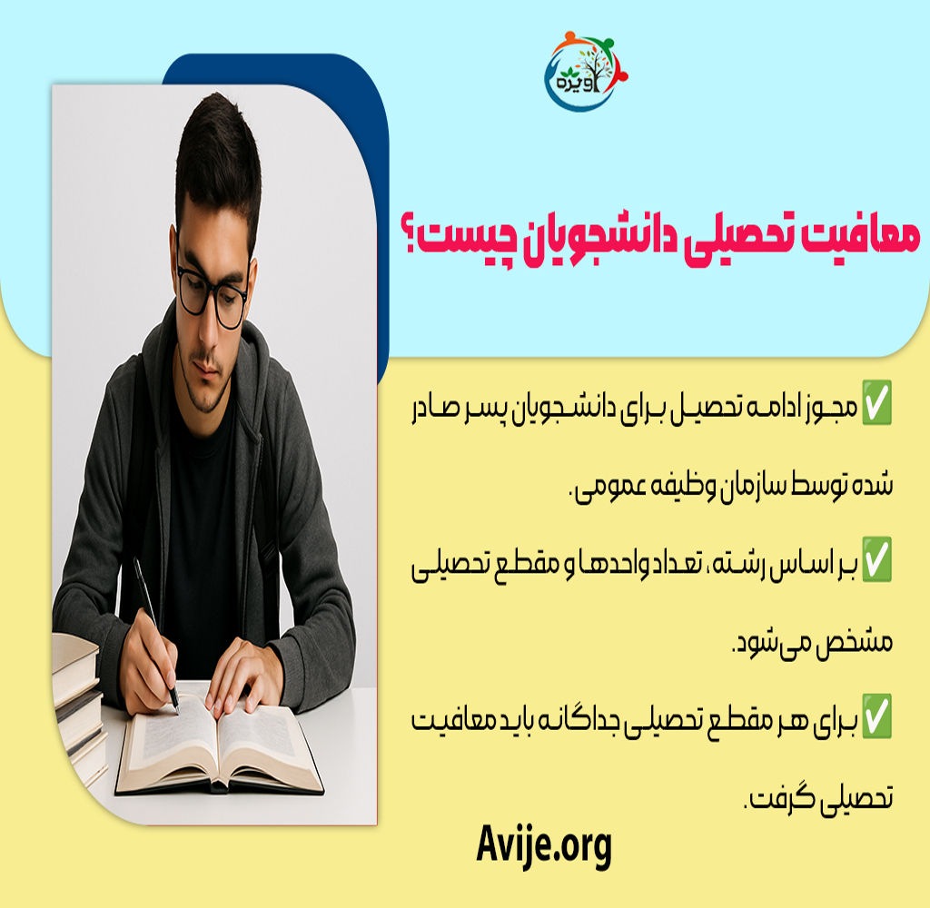 🟠 معافیت تحصیلی دانشجویی یعنی مجوز ادامه تحصیل مشمولان که از طرف سازمان وظیفه عمومی صادر می شود.