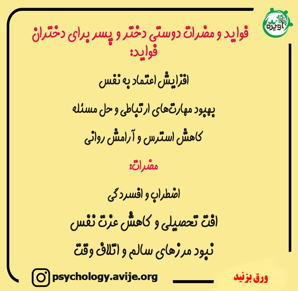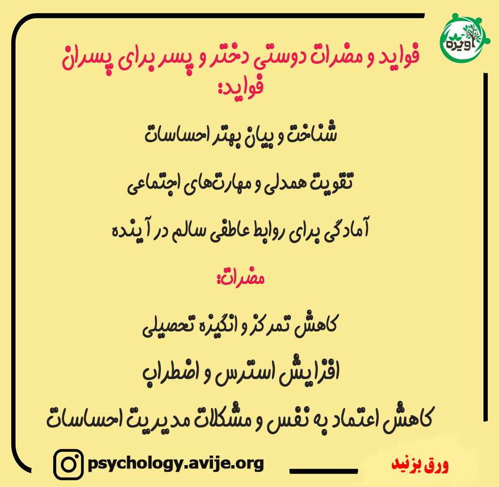 دوستی دختر و پسر در نوجوانی می توانند تجربه های مثبت و منفی برای نوجوانان به همراه داشته باشند. از جمله مزایا می توان به تقویت مهارت های اجتماعی، یادگیری درباره روابط و دریافت حمایت عاطفی اشاره کرد. اما معایبی نیز وجود دارد که شامل کاهش تمرکز بر تحصیل، افزایش خطر تعارض و آسیب پذیری نسبت به مشکلات عاطفی یا رفتارهای پرخطر است.