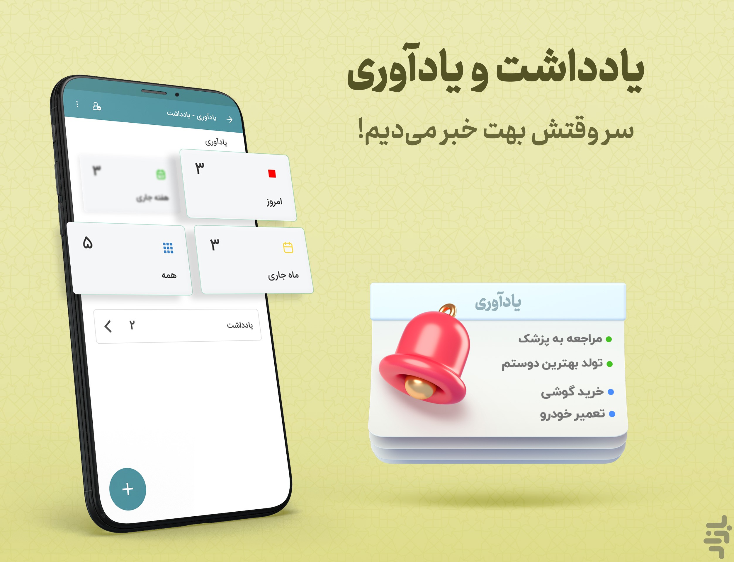 قرارهای کاری، روزهای تولد و همه روزهای مهم را برای یادآوری ثبت کنید و هر نکتهای که خواستید را یادداشت کنید.