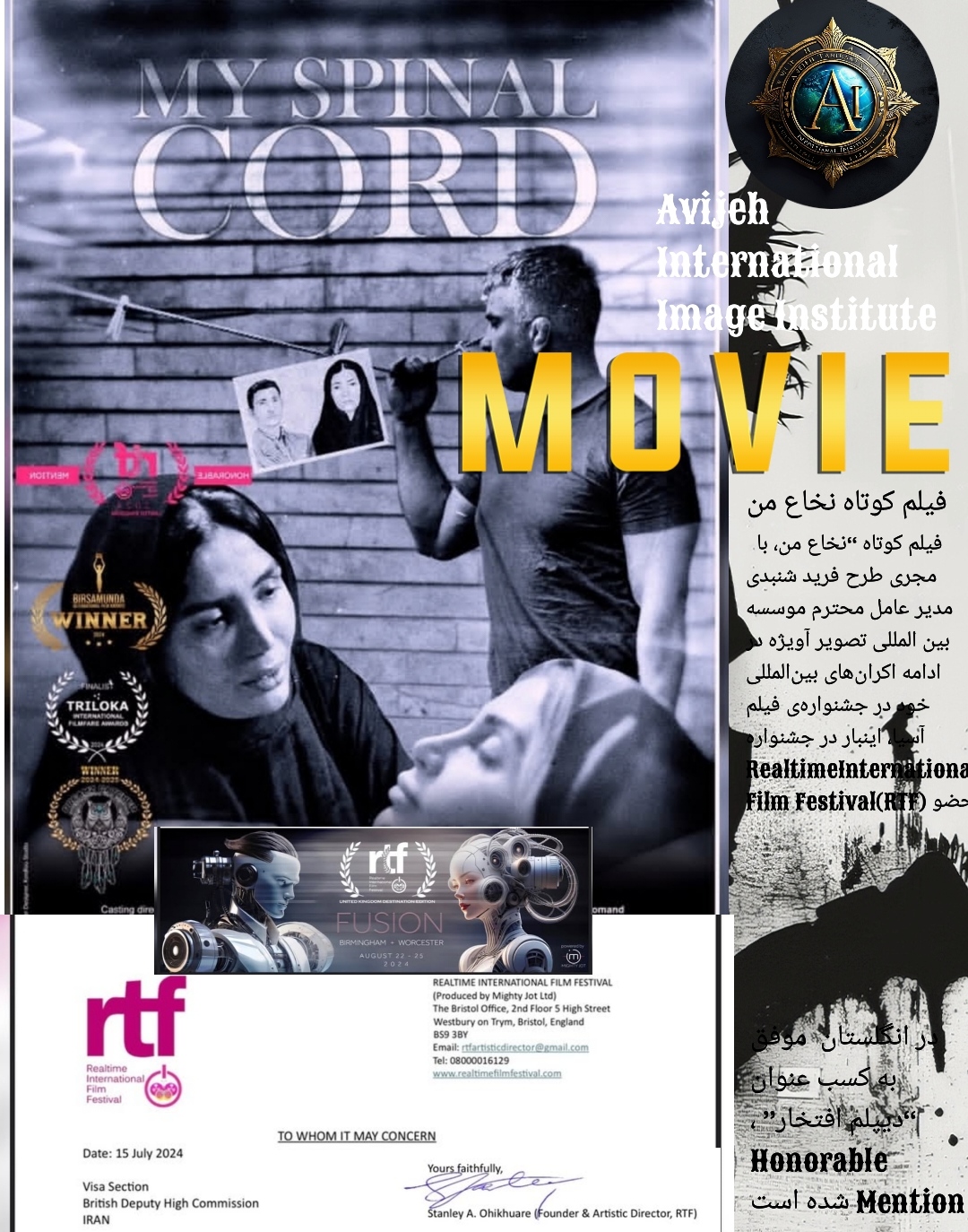 راهیابی به جشنواره آسیا فیلم کوتاه “نخاع من، با مجری طرح فرید شنبدی مدیرعامل موسسه بین المللی تصویر آویژه در ادامه اکرانهای بینالمللی خود در جشنوارهی فیلم آسیا، اینبار در انگلستان جشنواره RealtimeInternational Film Festival(RTF) حضور داشته و موفق به کسب عنوان “دیپلم افتخار” ، Honorable Mention شده است. جشنوارهی فیلم RTF رویدادی رقابتی برای فیلمهای کوتاه است که هر ساله در انگلستان برگزار میشود.