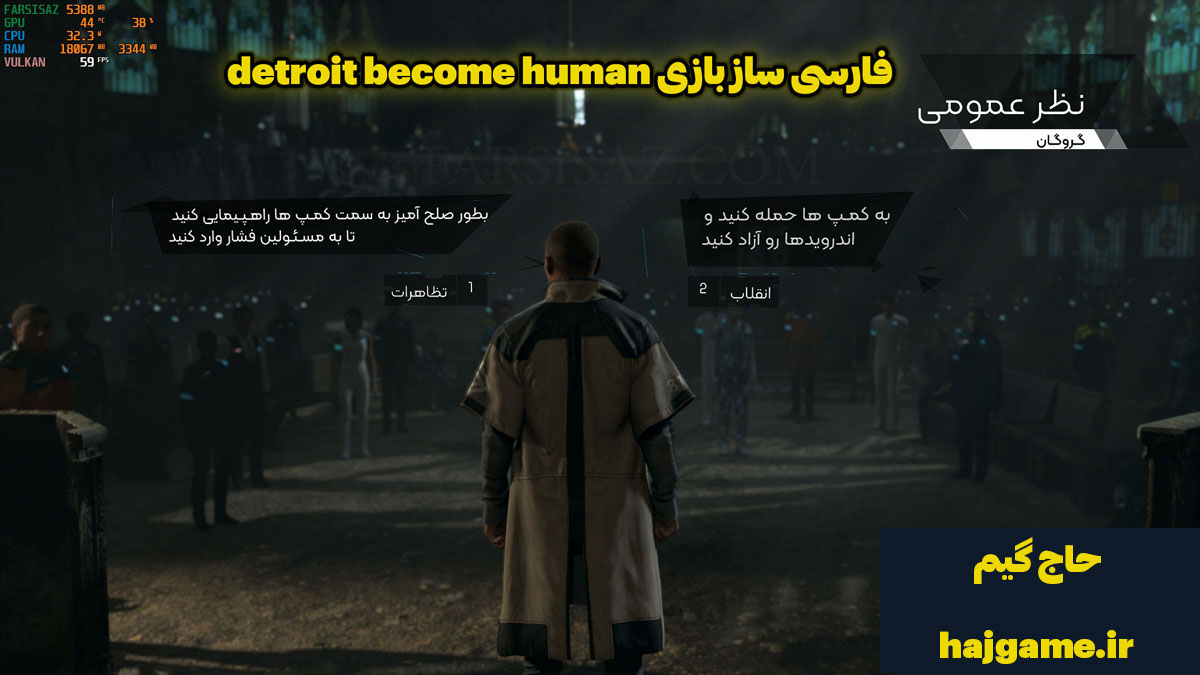 نکته مهم: با استفاده از فارسیساز حاج گیم، میتوانید از بازی Detroit: Become Human به زبان فارسی لذت ببرید و به درک عمیقتری از داستان و شخصیتها دست یابید. این فارسیساز یک سرمایهگذاری ارزشمند برای علاقهمندان به این بازی است.