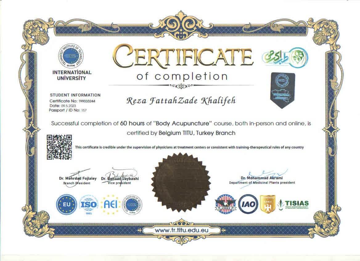 یکی از تجربههای ارزشمند من، شرکت در دوره بینالمللی Body Acupuncture در دانشگاه بلژیک واحد ترکیه بود. در این دوره، طب سوزنی بدن را بهصورت علمی و تخصصی زیر نظر اساتید برجسته فرا گرفتم. این شیوه درمانی با استفاده از تحریک نقاط خاصی روی بدن، به تنظیم انرژی، بهبود دردها و ارتقای سلامت عمومی کمک میکند. گذراندن این دوره باعث شد بتوانم از روشهای طب مکمل در کنار درمانهای گیاهی استفاده کنم و خدمات درمانی جامعتری ارائه دهم.