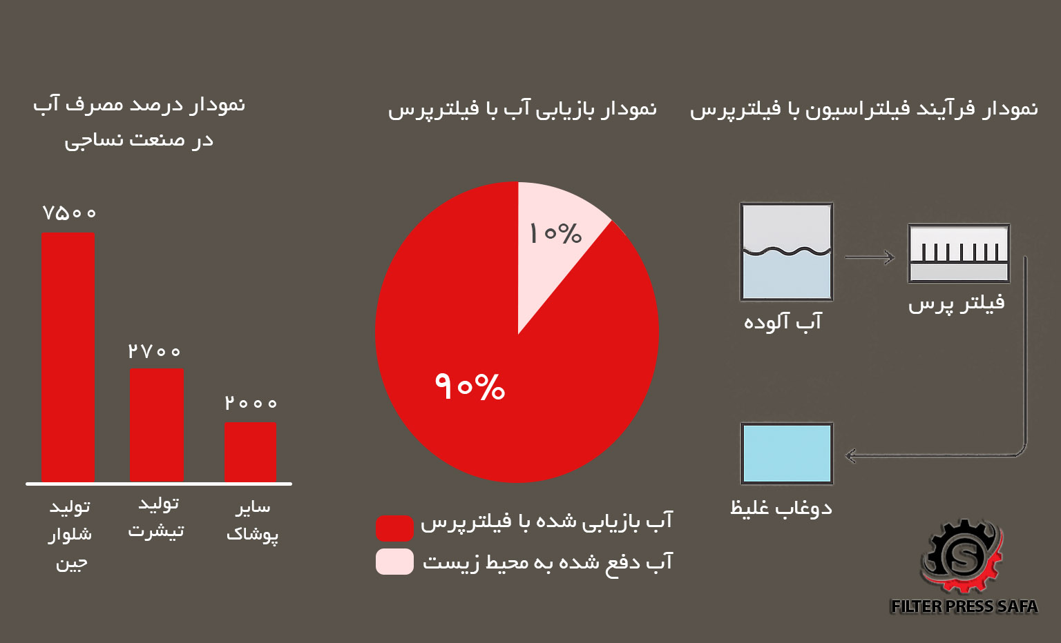 فیلترپرس یکی از تجهیزات کلیدی برای تصفیه فاضلاب صنعتی در صنایع نساجی و رنگرزی است. این دستگاه با طراحی منحصر به فرد خود قادر است آب مصرفشده در فرآیندهای رنگرزی و شستوشوی پارچهها را تا بیش از ۹۰٪ بازیابی کرده و برای استفاده مجدد آماده کند. عملکرد فیلترپرس به این شکل است که ذرات معلق و املاح بزرگتر از منافذ پارچههای فیلتر در پشت آنها باقی میمانند و محلولی تقریباً عاری از رنگ و ناخالصی تولید میشود.