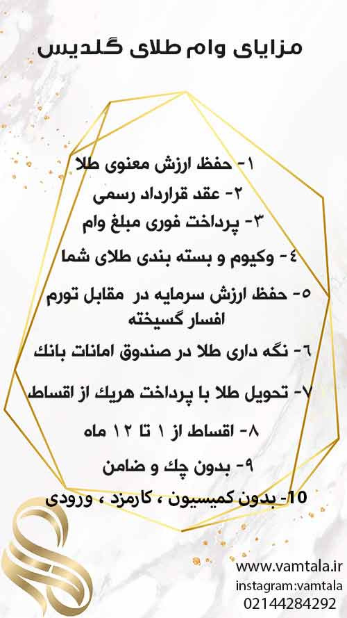 اگر به دنبال تأمین سرمایه فوری هستید، می توانید با طلاهایی که دارید به اندازه ارزش آنها از مجموعه طلای گلدیس وام طلا و سکه فوری بدون نیاز به ضامن دریافت کنید.