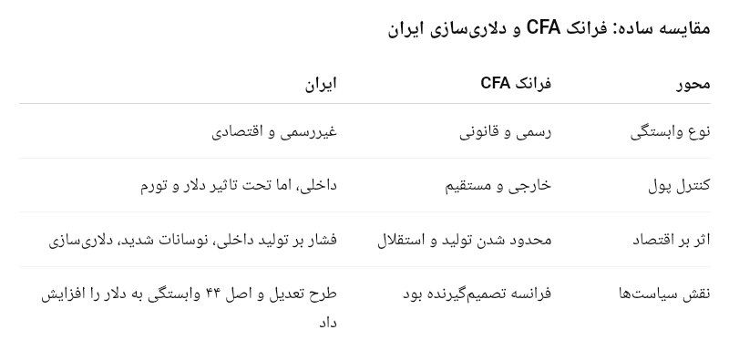 نوسان دلار بازار آزاد، تعیینکننده قیمت کالاها و تورم در ایران است. درست مانند فرانک CFA، وابستگی به دلار محدودیت در تصمیمگیری اقتصادی ایجاد میکند؛ اما در ایران این وابستگی غیررسمی و اقتصادی است، نه قانونی.
