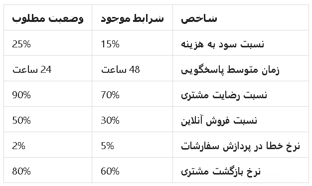تعریف شاخصهای مطلوب: تعیین شاخصهایی که نشاندهنده موفقیت در دستیابی به وضعیت مطلوب هستند. به عنوان مثال:افزایش 20 درصدی در فروش در یک سال. کاهش زمان تحویل به زیر 24 ساعت. افزایش رضایت مشتری به 90%. کاهش نرخ خطا در پردازش سفارشات به زیر 2%.