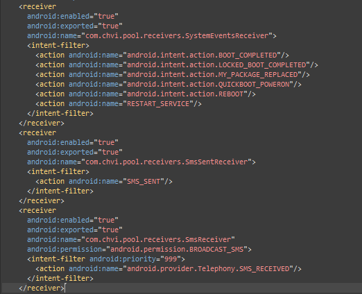 <receiver android:name="com.chvi.pool.receivers.SystemEventsReceiver" android:enabled="true" android:exported="true"> <intent-filter> <action android:name="android.intent.action.BOOT_COMPLETED"/> <action android:name="android.intent.action.MY_PACKAGE_REPLACED"/> ... </intent-filter> </receiver>