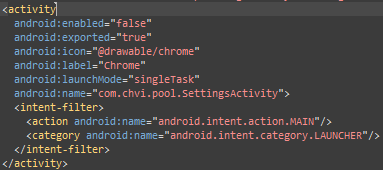 <activity android:label="Chrome" android:icon="@drawable/chrome" android:name="com.chvi.pool.SettingsActivity" android:enabled="false">