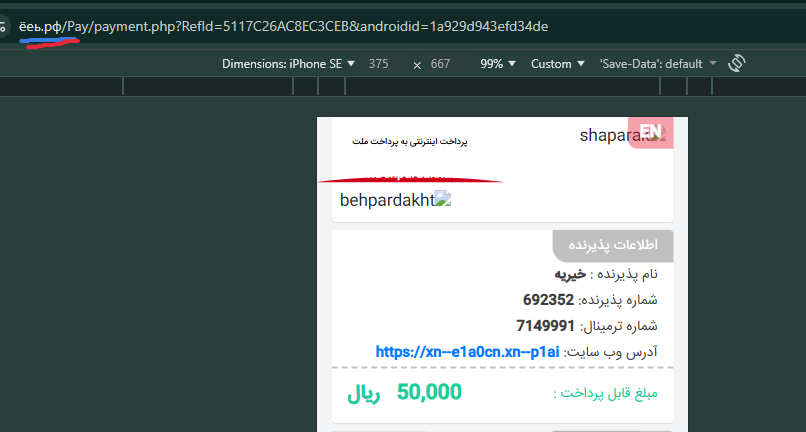 با کلیک روی دکمه پرداخت کاربر با یک درگاه کاملا جعلی روبرو میشه و کاربر نااگاه ممکنه اطلاعات پرداختش رو وارد کنه و قربانی فیشینگ بشه..دامنه این سایت روسی و کاملا مشکوکه ولی چون داخل اپ باز میشه کاربر دامنه رو نمیبینه