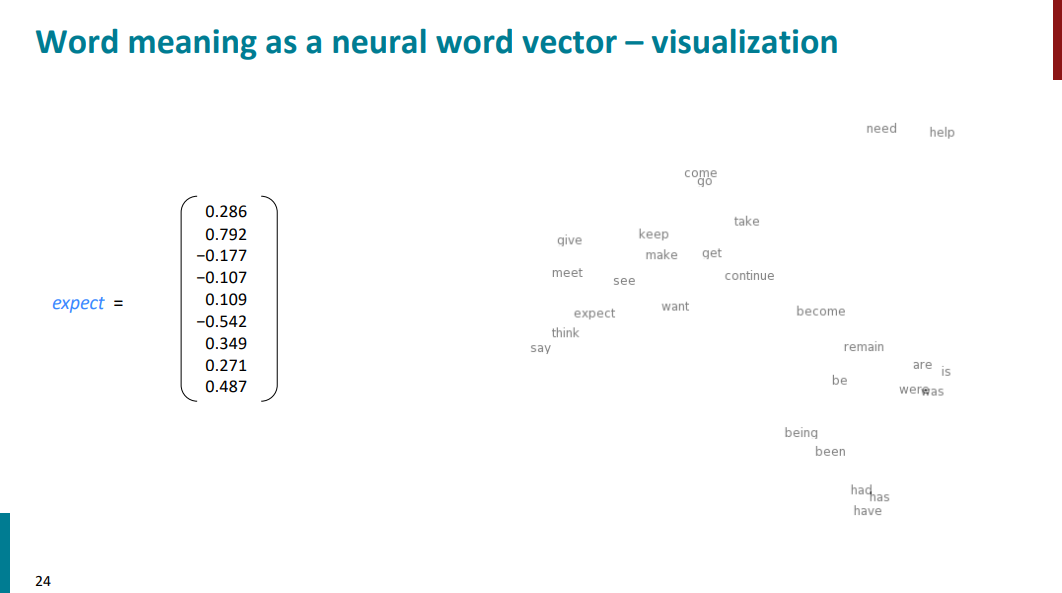 با این روش معنای کلمات بهتر با اعداد و بردارها تعریف میشه. از اونجایی که مغز انسان درکی از 300 بعد یا حتی 8 بعد نداره، برای اینکه بفهمیم آیا واقعا معنای کلمات به درستی با این روش تعریف میشن یا نه، اومدیم صرفاً از دو بعد استفاده کردیم و چند تا از کلمات مختلف رو که با این روش امبد شده بودن رو تو اسلاید پایین نمایش دادیم. وقتی از 300 بعد فقط دو بعد رو نگه میداریم در واقع درصد خیلی زیادی از اطلاعات رو داریم دور میریزیم، اما با این حال باز هم تا حد خوبی میشه تمایز بین کلمات رو دید. مثلاً تو اسلاید زیر افعال had و has و have تو یک گروه کنار هم قرار گرفتن یا اینکه افعال need و help هم نزدیک هم هستن. این مثال نشون میده که با این روش چطور کامپیوترها میتونن تا حد خیلی خوبی معنای کلمات رو به همون صورتی که انسانها درک میکنن درک کنن.