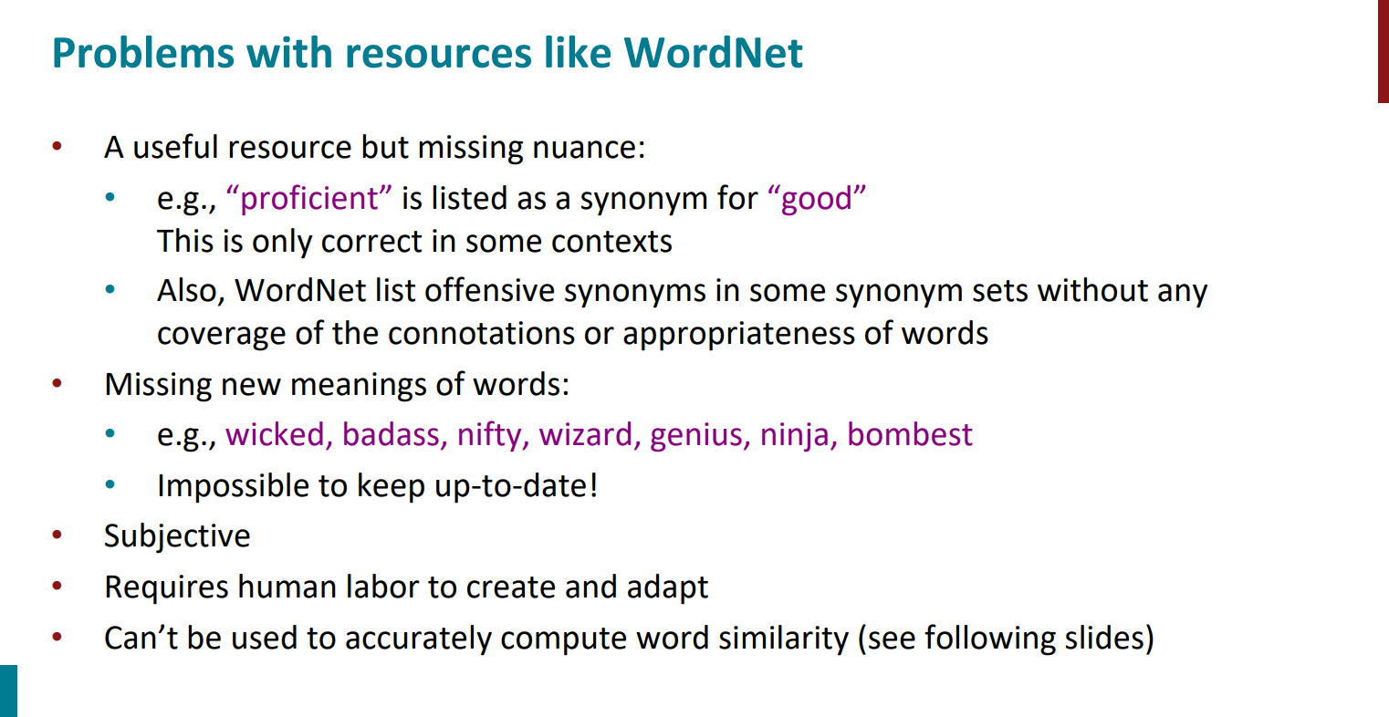 اول اینکه نمیشه بین کلماتِ مترادف تمایز قائل شد. دو کلمهی خوب و خفن میتونن مترادف باشن، ولی ما بعنوان انسان میفهمیم که باهم دیگه فرق دارن، ولی این تفاوت رو نمیشه توی این مدل دیکشنریها مشخص کرد.