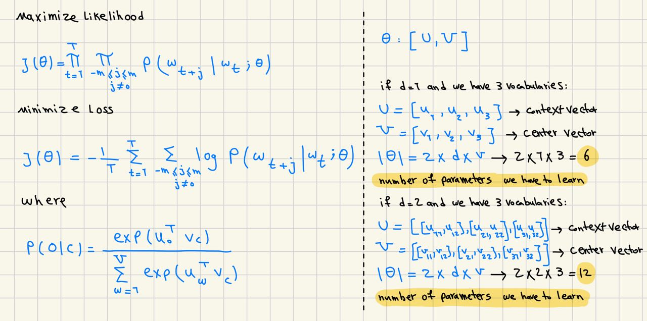 تا اینجا گفتیم چی؟ گفتیم هر دفعه میایم یک کلمه رو بعنوان target در نظر میگیریم و بعد یک پنجره برای تعداد کلمات context در نظر میگیریم. بعد احتمال کلمات context رو با توجه به اون کلمه target محاسبه میکنیم. در نهایت احتمالاتی که به دست آوردیم رو در هم ضرب میکنیم و میریم سراغ کلمهی بعدی و دوباره همین پروسه رو تکرار میکنیم. تعریف ریاضی این چیزایی که گفتیم میشه likelihood که تو اسلاید پایین آورده شده.