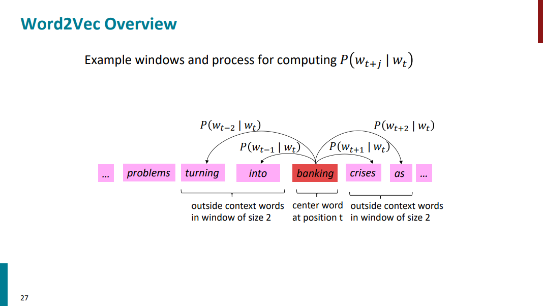 فرض کنید یه متنی داریم مثل اسلاید پایین و کلمه into رو بعنوان center با اندیس t انتخاب کردیم. خود کلمه into رو به صورت w_t نشون میدیم. (منظورمون از اندیس صرفاً شمارهایه که به اون کلمه دادیم، مثلا 0، 1، 2 و ... تا رسیدیم به شمارهی t. وقتی میگیم t-1 یعنی اندیس یک کلمه قبل از کلمه با اندیس t، وقتی میگیم t+1 یعنی اندیس یک کلمه بعد از اون و همینطور برای t-2 و t+2 که یعنی اندیس دو کلمه قبل و اندیس دو کلمه بعد و الی آخر. خود کلمات رو با w نشون میدیم. مثلاً w_t-1 یعنی یک کلمه قبل از w_t و یا w_t+1 یعنی یک کلمه بعد از w_t).