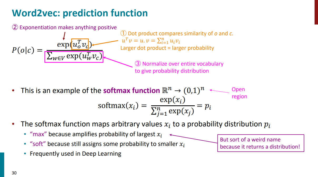 قراره احتمال حساب کنیم، احتمالِ چی؟ احتمال P(o | c). به این معنی که اگر یک کلمهای مثل c بعنوان target یا center بهمون داده باشن، با چه احتمالی کلمه (یا کلمات o) در مجاورت کلمه c قرار میگیرن؟ (به زبان ساده، کلمه وسطی رو بهمون دادن، قراره بیایم احتمال کلمات همسایه رو حساب کنیم.) قراره بیایم از تابع softmax استفاده کنیم. اگه از قبل آشنایی با مباحث ماشین لرنینگ یا دیپ لرنینگ داشته باشید میدونید softmax چیه، ولی اگر نمیدونید، خیلی چیز عجیب غریبی نیست، کل کاری که میکنه اینکه هر عددی رو تو بازه حقیقی بعنوان ورودی میگیره و میبرتش تو بازهی 0 تا 1.به صورت دقیقتر محاسباتی که انجام میده سه مرحله داره: