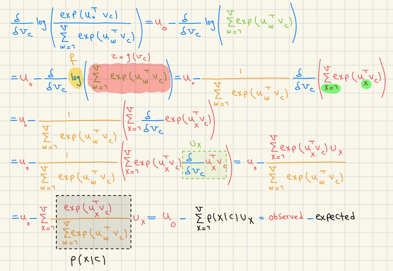 برای مشتق گرفتن از مخرج کسر (عبارت b تصویر بالا)، باید بیایم از قوانین مشتق زنجیرهای استفاده کنیم. فرض کنید دو تا تابع f و g رو داریم (تابع g داخل تابع f) و قراره که از تابع f(g(v_c)) نسبت به v_c مشتق بگیریم. تابع f تابع لگاریتمه و تابع g بعد از کمی تغییر، همون تابع softmax عه که بالاتر باهاش آشنا شدیم. جزییات محاسبات در هر مرحله تو تصویر زیر آورده شده. در نهایت، داریم از مقدار واقعی (observed) مقدار expected (پیش بینی مدل) رو کم میکنیم و دنبال این هستیم که این اختلاف رو کمتر و کمتر کنیم. به عبارتی دیگه، مقدار پیش بینی مدل رو به مقادیر واقعی نزدیک کنیم.