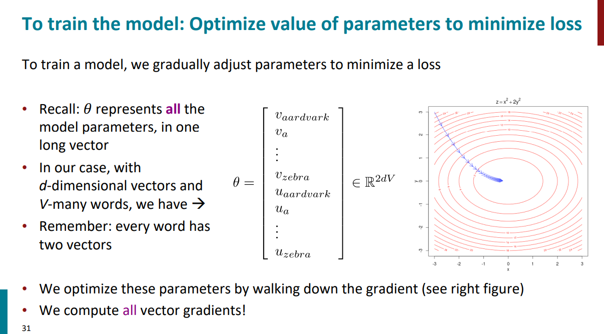گفتیم که برای هر کلمه دو تا وکتور در نظر میگیریم. به صورت دقیقتر، کل این دو تا وکتور با تتا نمایش داده میشن و ابعاد تتا برابره با 2 (چون دو تا وکتور داریم برای هر کلمه) در d در V. منظور از d ابعادی هست که داریم و منظور از V تعداد کلماتی که در نظر گرفتیم. هدف این بود که بیایم بهترین مقدار این پارامتر تتا رو حساب کنیم به صورتی که تابع هزینه کمینه بشه. به زبان ریاضی برای پیدا کردن مینمم تابع هزینه باید بیایم از گرادیان کاهشی استفاده کنیم. اینکه گرادیان کاهشی چیه و چه جزییاتی داره تو این پست بهش پرداخته شده. در ادامه خواهیم دید که چطور از مشتق زنجیرهای استفاده میکنیم تا بتونیم گرادیان رو حساب کنیم.
