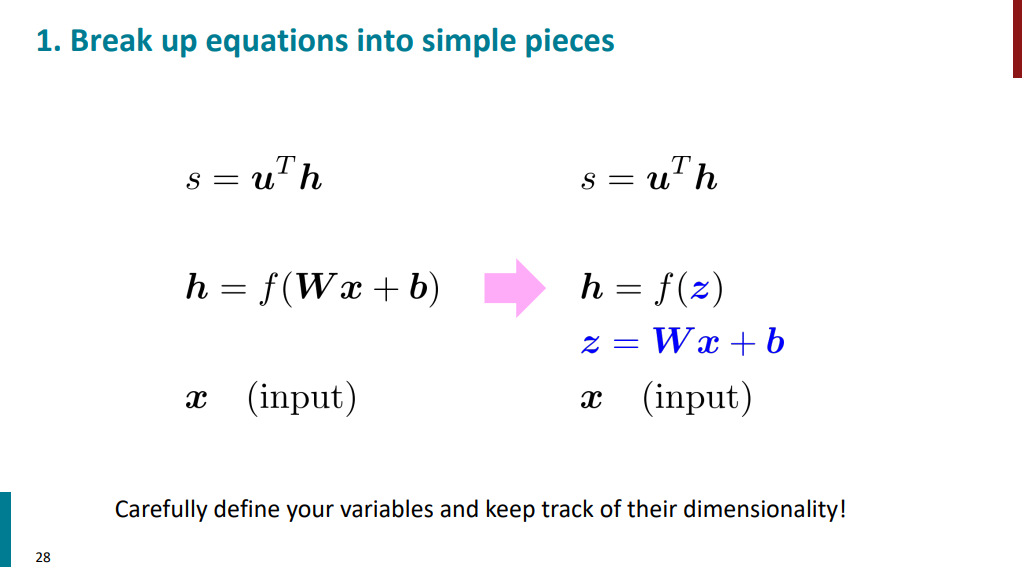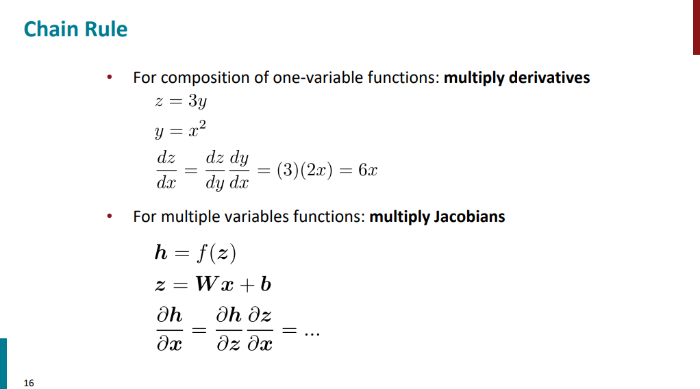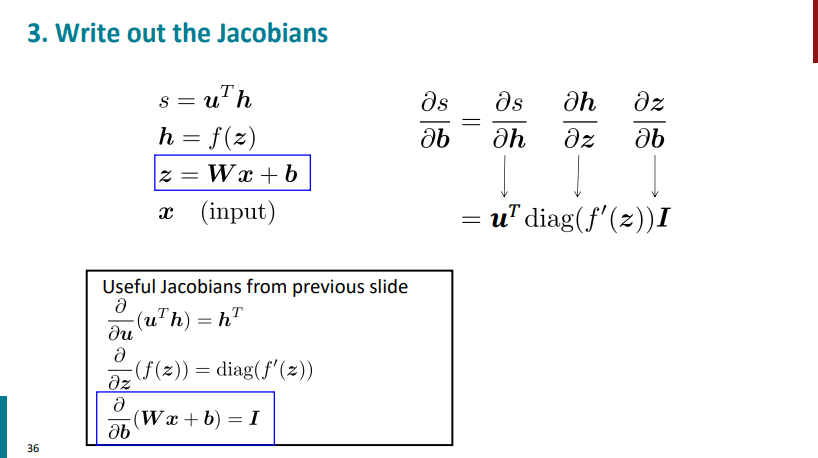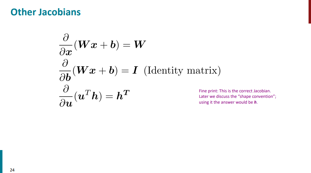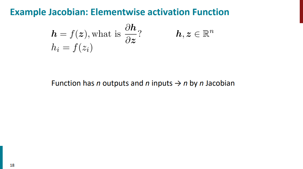 حالا اسلاید زیر رو در نظر بگیرید. قراره از Wx+b یکبار نسبت به x و یک بار نسبت به b مشتق بگیریم. تو حالت اول جواب میشه ماتریس W و تو حالت دوم جواب میشه ماتریس همانی. دقت کنید که اینجا با تک متغیر طرف نیستیم. چند ورودی و چند خروجی داریم برای همین ماتریسهای ژاکوبینی هم که ساخته میشه به این صورت در میاد.
