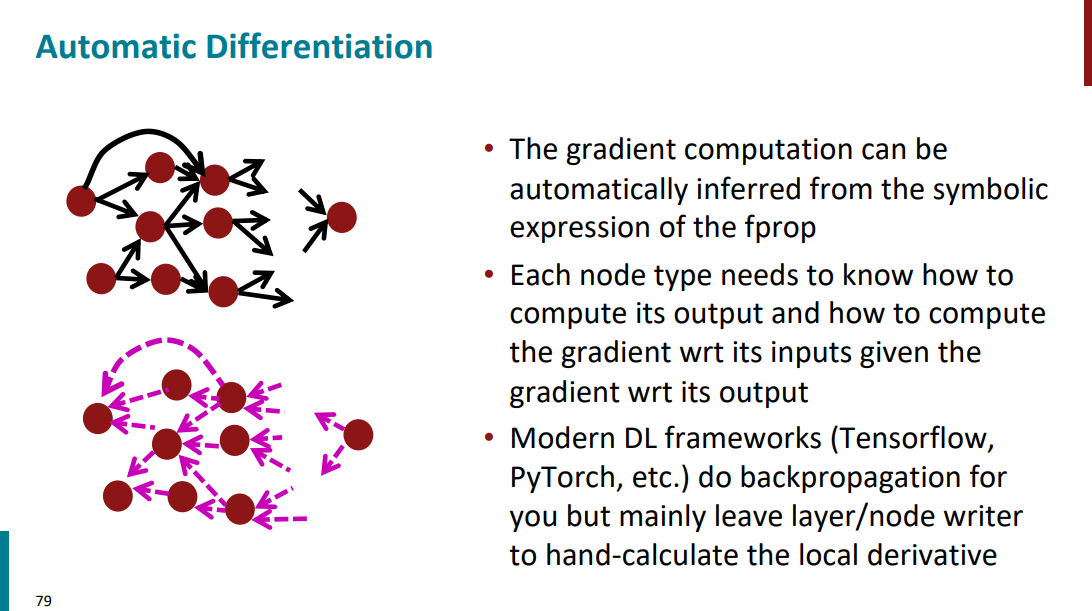 توی سیستمها و فریمورکهایی که توسعه داده شدن، دیگه نمیان دستی گرادیان حساب کنن. کاری که اینجا انجام میشه به این صورته که یک بار f-prop انجام میشه و خروجی هر نود محاسبه میشه. بعد، رابطهی ریاضی بین ورودی و خروجی اون نود هم به دست میاد. در نهایت، از روی همین روابط و بدون اینکه نیاز باشه خودمون کاری برای محاسبهی گرادیانها انجام بدیم، سیستم بهصورت خودکار فرمولهای گرادیان رو استخراج میکنه.