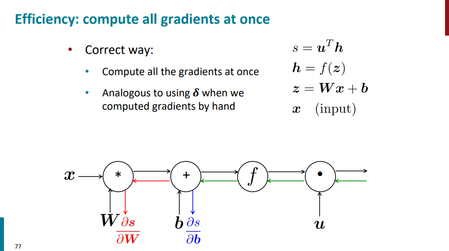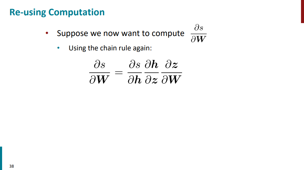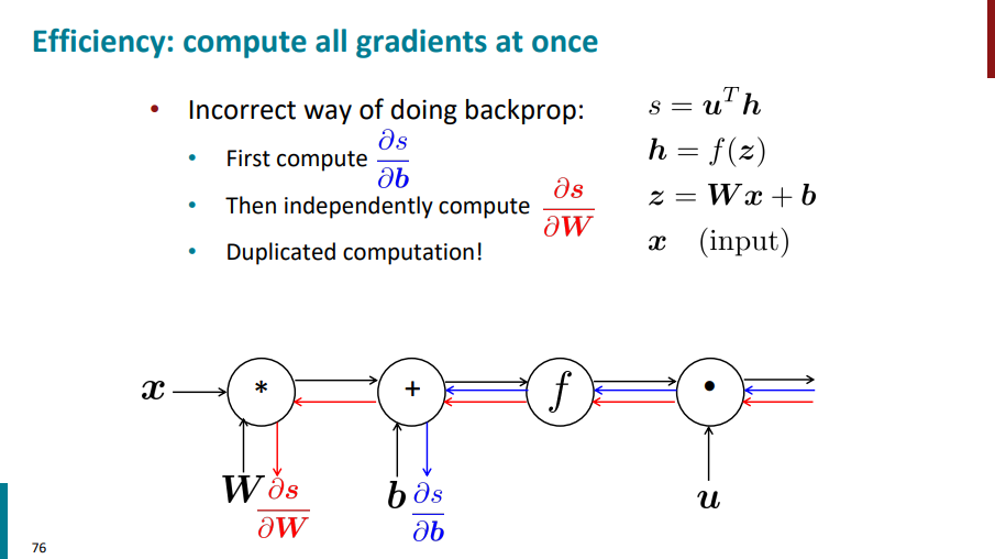 بعد برای محاسبه گرادیان s نسبت به W هم مجدداً بیایم مسیر قرمز رنگ رو از سمت راست طی کنیم به سمت چپ بریم و گرادیان حساب کنیم. این کار درستی نیست! چون داریم یک سری محاسبات رو بارها و بارها تکرار میکنیم و استفاده نادرست از منابعمون میکنیم.