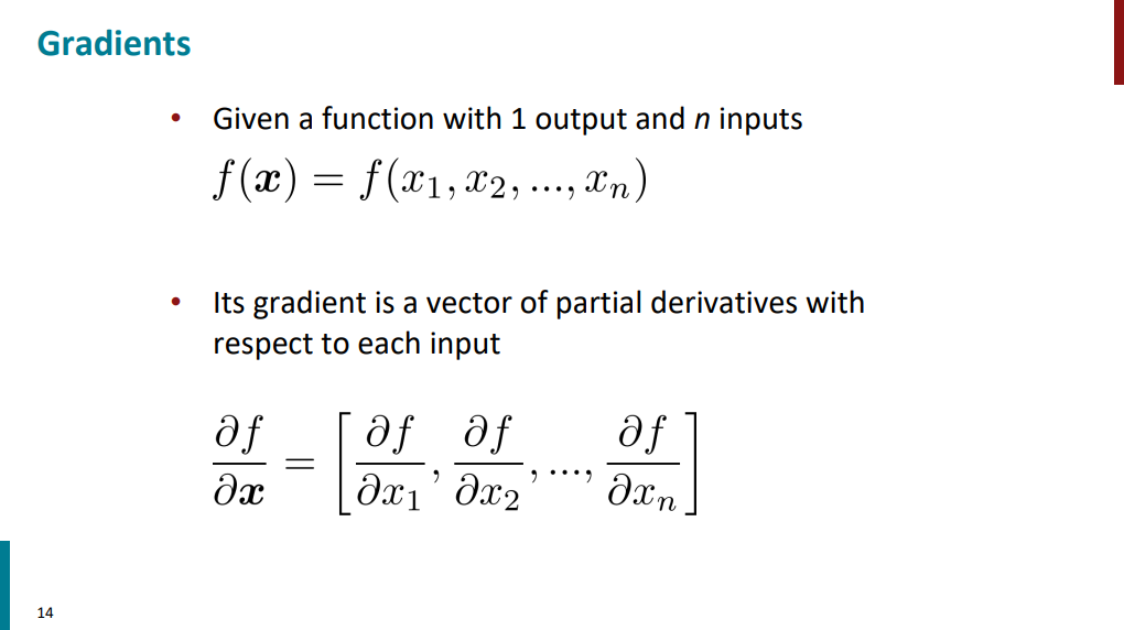 یک قدم جلوتر بریم و ببینیم اگر تابع چند ورودی و یک خروجی داشته باشه گرادیان چطور میشه. تو این حالت گرادیان به جای یک عدد یک برداره که هر مولفهش مشتقهای جزیی تابع نسبت به هر ورودیه. مثلاً مولفهی اول بردار گرادیان، مشتق جزیی تابع نسبت به ورودی x1 هست و همینطور الی آخر. منظور از مشتق جزیی هم همون مشتق عادیه که تو مثال قبلی دیدیم.
