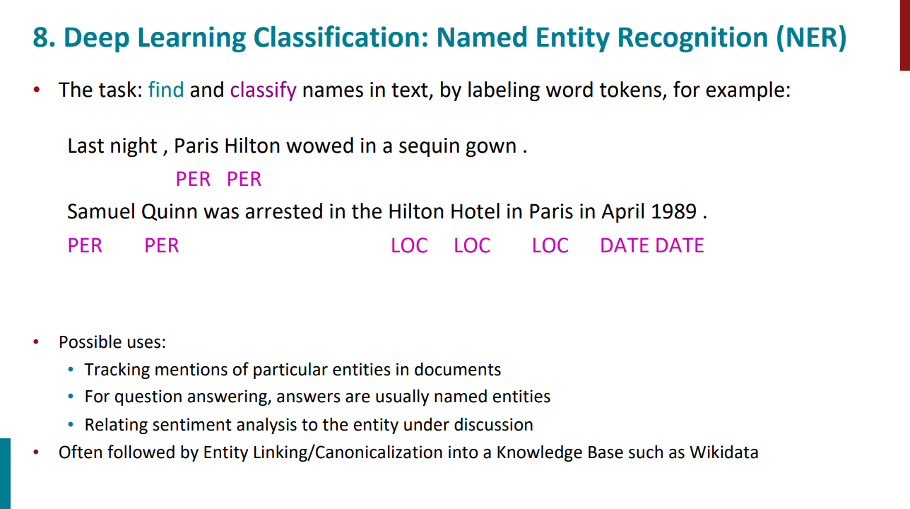 قراره با یک تسک NLP ساده این جلسه رو شروع کنیم. این تسک میاد یه متن تو ورودی میگیره و تو خروجی اسم افراد، مکانها، تاریخها و ... رو مشخص میکنه. برای انجام این تسک قرار نیست بیایم از دیکشنری استفاده کنیم. مثلاً بگیم من کلمه پاریس رو داخل دیکشنری دارم، میدونم اسم مکانه، پس هر جا پاریس دیدی با تگ LOC مشخص کن. ممکنه کلمه پاریس اسم فرد هم باشه و همیشه در نقش شهر پاریس نباشه. پس قراره با توجه به متن و context بیایم این تسک رو انجام بدیم.