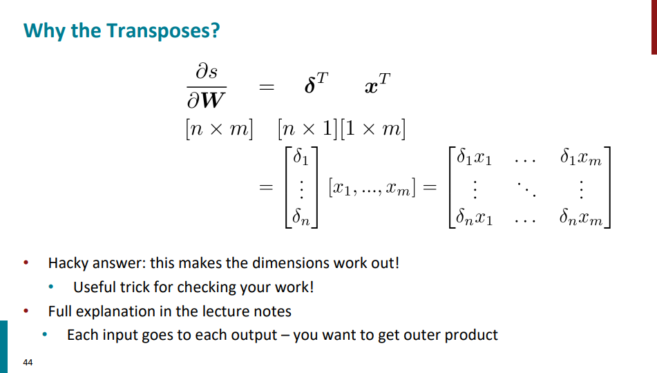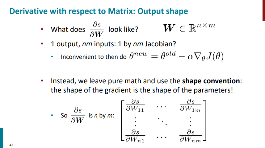 یک بار دیگه گرادیان s نسبت به W رو بررسی کنیم. اگه از ریاضیات محض برای محاسبات استفاده کنیم، ماتریس ژاکوبینِ گرادیان s نسبت به W حاوی یک سطر و n*m ستون خواهد بود. منتها این ماتریس رو نمیتونیم با بردار W که ابعادش n در m هست ضرب ماتریسی کنیم برای همین باید ابعادش رو تغییر بدیم به ماتریسی با n سطر و m ردیف. چرا این موضوع برامون مهمه؟ چون قراره در نهایت وزنهای مدل رو با استفاده از گرادیان کاهشی آپدیت کنیم و لازمه گرادیان همشکل خود وزنها باشه.