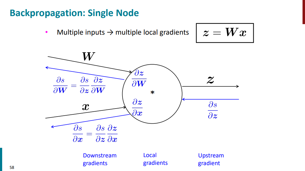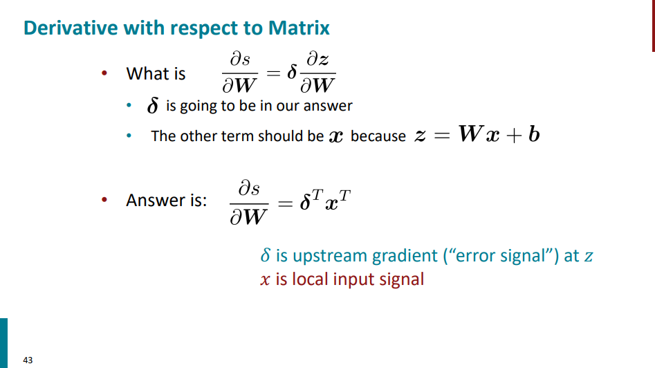 گفتیم که برای محاسبه گرادیان s نسبت به W داریم: دلتا در مشتق z نسبت به W. بخش دلتاش که هیچی مشخصه، بخش دوم رو باید حساب کنیم. میدونیم که z در واقع تابعی از W و x عه. پس اگه ازش نسبت به W مشتق بگیریم، جواب میشه x. پس برای جواب نهایی گرادیان s نسبت به W داریم دلتا در x.