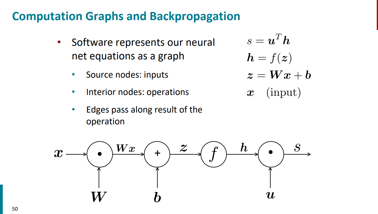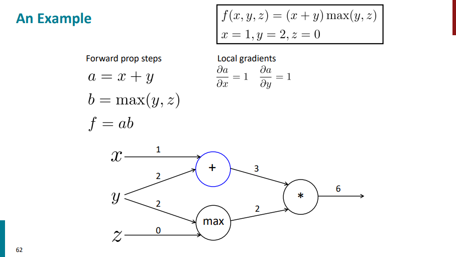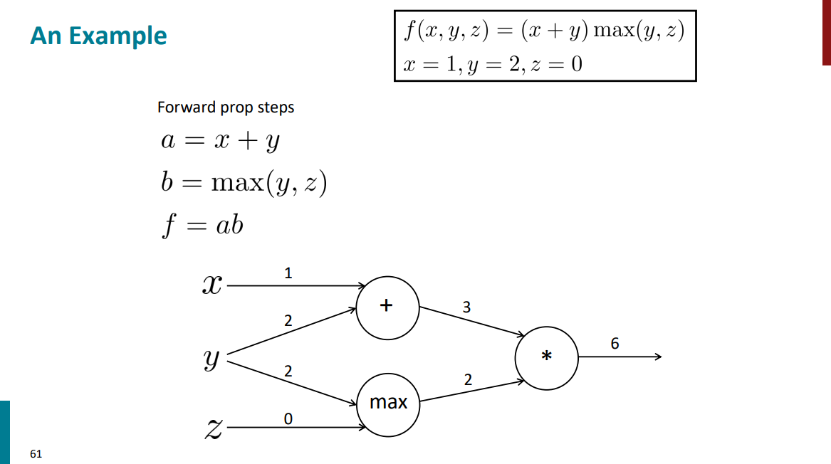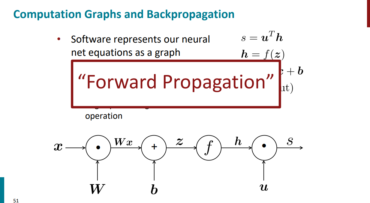 با یک مثال توضیح راحتتری داره. گراف محاسباتی اسلاید قبل رو در نظر بگیرید. اگر به ازای ورودیهای مختلف شروع کنیم از چپ به راست بیایم و جواب نهایی رو برای s حساب کنیم، در واقع داریم forward propagation انجام میدیم.