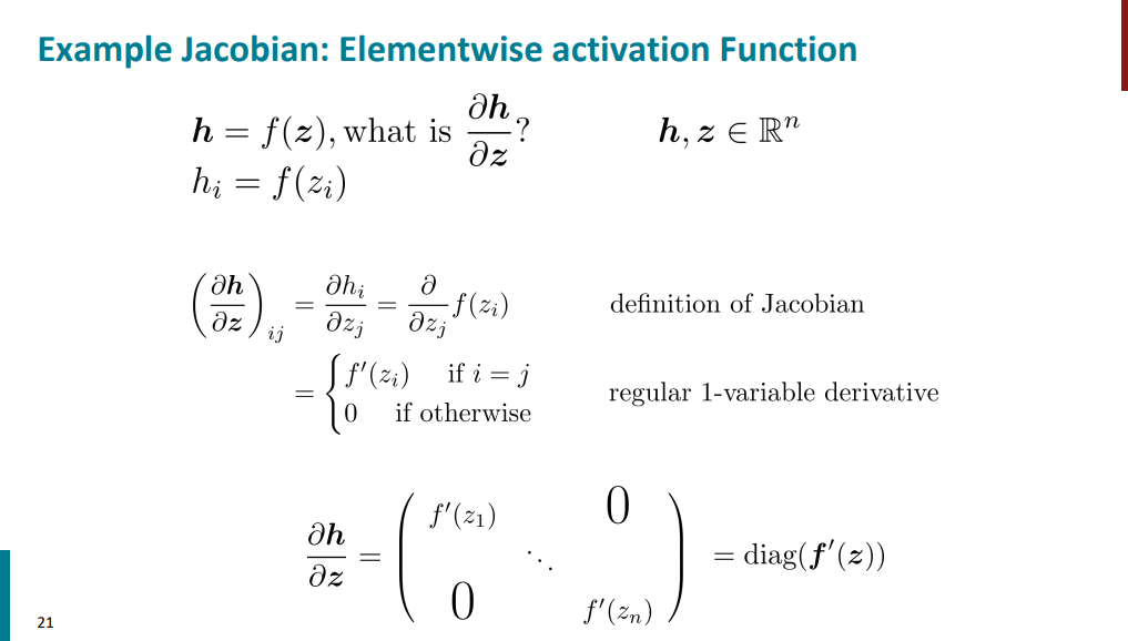 حالا اگه بیایم مشتق هر مولفه تابع h رو نسبت به هر مولفه تابع z محاسبه کنیم در نهایت یه یک ماتریس قطری خواهیم داشت. دلیلش هم اینکه فقط وقتی روی قطرها هستیم تغییر ورودی باعث تغییر خروجی میشه، تو بقیه مواقع اینا هیچ تاثیری رو هم ندارن و مشتقشون صفر میشه. (تابع h یک تابع غیر خطی مثل سیگمویده).