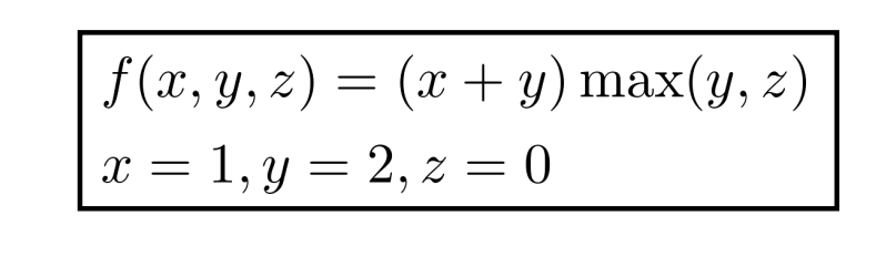فرض کنید تابعی داریم به شکل زیر (دو متغیر x و y رو باهم جمع میکنه، حاصلش رو ضرب میکنه در مقدار بیشینه بین y و z) که مقادیر اولیه هم براش تعیین شده: