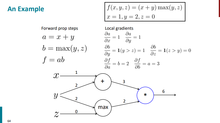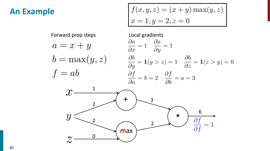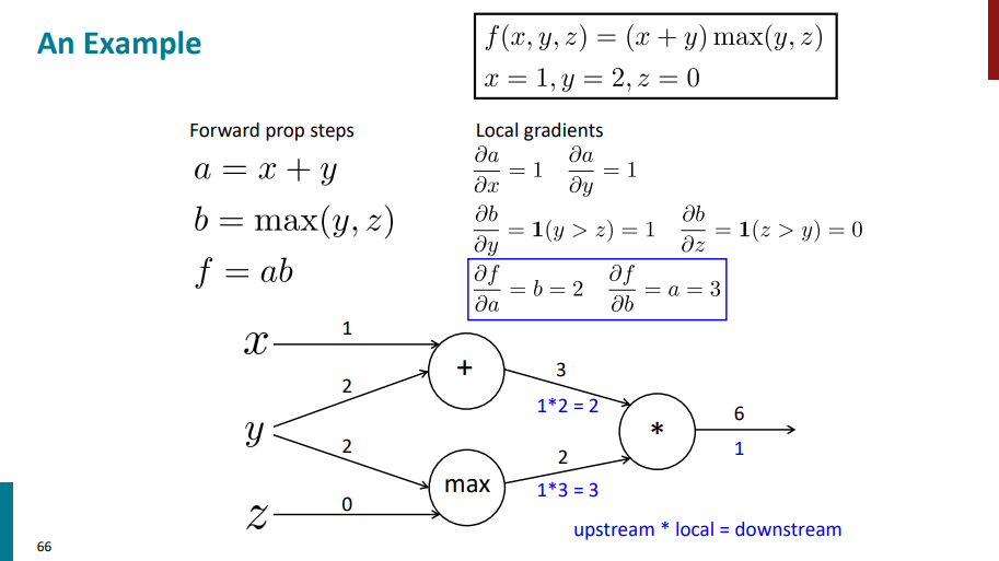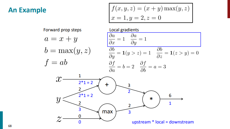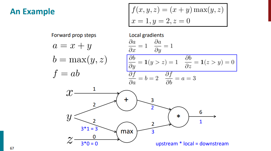 حالا یک لایه دیگه برمیگردیم عقبتر. اول محاسبات رو برای نود max انجام میدیم. تو این مرحله مشتق لایه بالایی در واقع همون مشتقهای زنجیری هست که تو مرحله قبلی حساب کردیم. یک سری مشتق محلی هم داریم که از قبل حساب کردیم (مشتق b نسبت به y و مشتق b نسبت به z). حالا باید مشتقهای محلی رو در مشتق یک لایه بالاتر ضرب کنیم تا مشتق نهایی این لایه هم به دست بیاد.