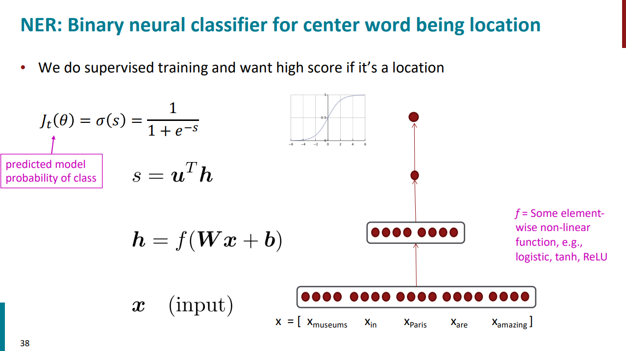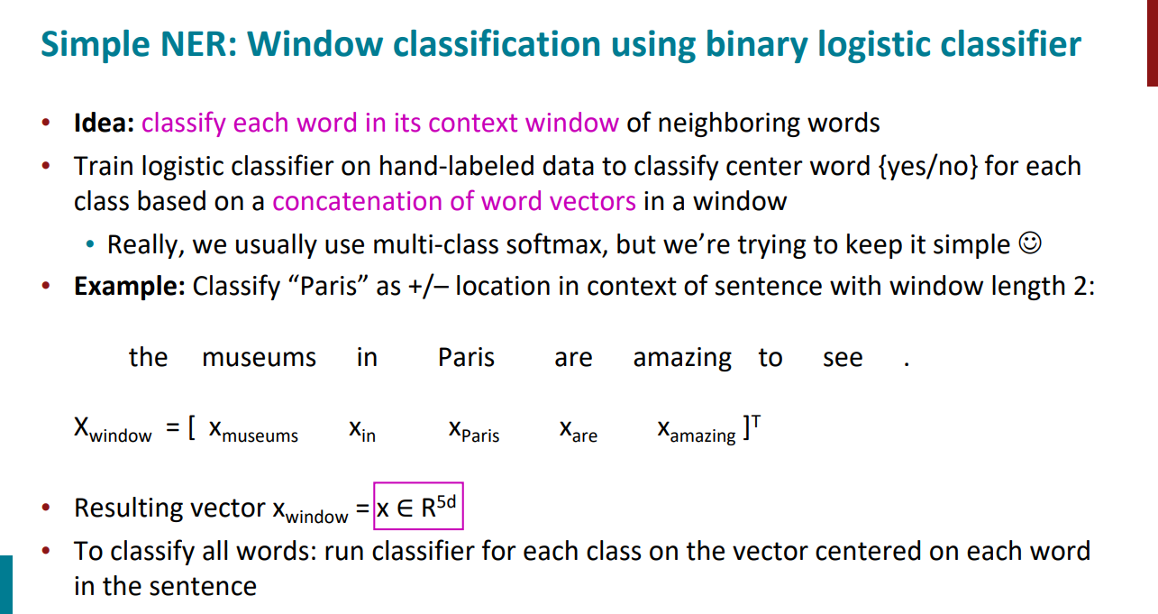 چجوری با استفاده از شبکههای عصبی میتونیم این تسک رو انجام بدیم؟ روشهای زیادی وجود داره اما یکی از روشهای خیلی ساده برای انجام این تسک اینکه بیایم از یک کلسیفایر باینری استفاده کنیم. قراره یک جمله حاوی کلمه پاریس بهش بدیم و بهمون بگه آیا کلمه پاریس اسم مکان هست یا خیر.