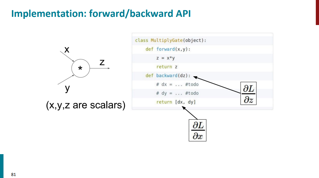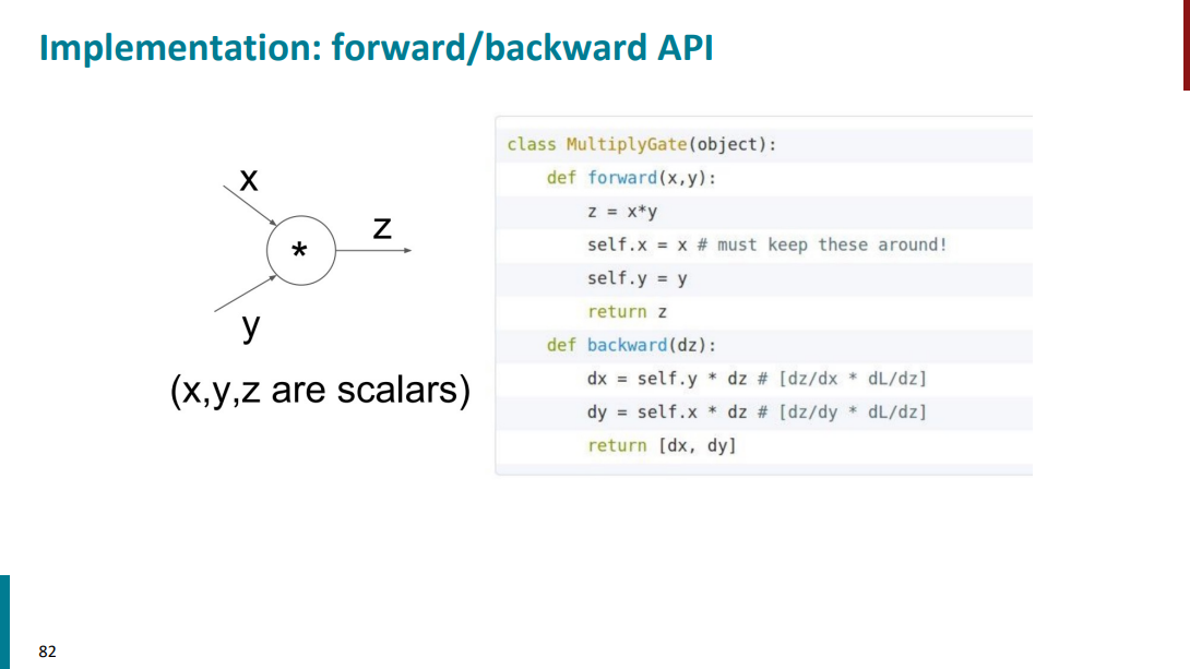 فرض کنید نود ضرب (یا ستاره) داریم با دو تا ورودی x و y و خروجی z. تابع f-prop مشخصاً میاد ورودیهارو میگیره و ضرب میکنه تو هم و خروجیشو میریزه داخل z. حالا برای قسمت b-prop باید حواسمون باشه که مشتقهای محلی رو باید خودمون دستی تعریف بکنیم. تا در نهایت بتونیم مشتق خروجی رو نسبت به ورودیها داشته باشیم.