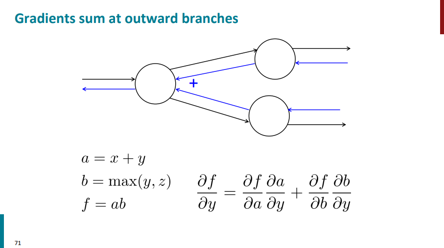 اگه از یک نود دو تا یال خارج شده باشن، موقع انجام backward propagation و محاسبه گرادیانها در واقع دو تا یال به اون نود وارد شدن. پس در نهایت باید گرادیانهایی که برای اون نود داریم رو باهم دیگه جمع کنیم.