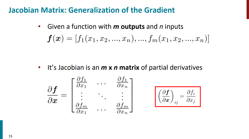 حالا اگه تابع n ورودی و m خروجی داشته باشه چی؟ تو این حالت گرادیان دیگه یک عدد یا یک بردار نیست، بلکه به صورت یک ماتریس در میاد. به این ماتریس، ماتریس ژاکوبین گفته میشه و m سطر و n ستون داره. در هر سطر هم مشتقهای خروجی اون سطر نسبت به همهی ورودیها نوشته میشه (سطر اول خروجی اول تابع، سطر دوم خروجی دوم تابع، الی آخر).