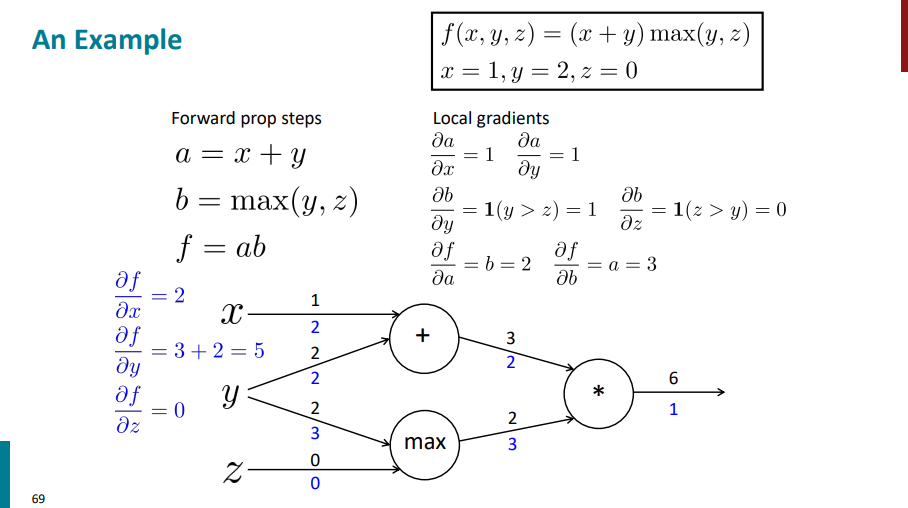 حالا بریم سراغ نود آخر که معادله با عبارت f. اگر از f نسبت به a مشتق بگیریم، جواب میشه b و اگر از f نسبت به b مشتق بگیریم جواب میشه a. چون مقادیر رو برای a و b حساب کردیم و از قبل میدونیم، پس به ترتیب جواب نهایی برای مشتقها میشه 2 و 3.