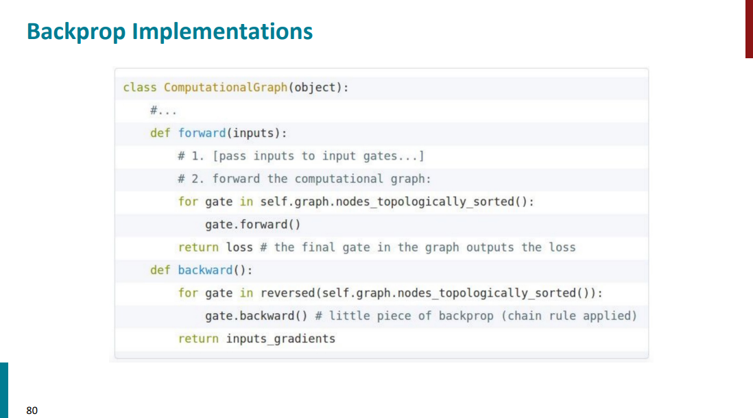 برای مثال یه تیکه کد در اسلاید پایین آورده شده که نشون میده چطور باید از گراف محاسباتی استفاده کرد برای انجام f-prop و b-prop. مثلاً تو مرحله f-prop نیازه که ورودیهای گراف رو خودمون مشخص کنیم. اما بقیه مراحل به کمک توابع از قبل تعریف شده قابل انجام هستن.