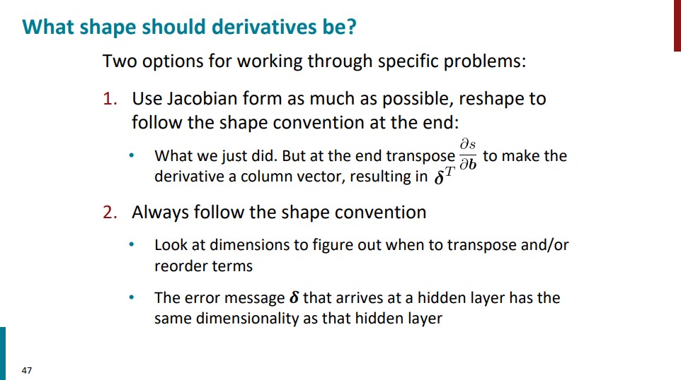 بالاتر گفتیم که برای محاسبه گرایان s نسبت به W نیاز داریم که از shape convention استفاده کنیم و ریاضیات محض رو کنار بذاریم و ابعاد ماتریس ژاکوبین رو تغییر بدیم. به صورت مشابه برای محاسبه گرادیان s نسبت به b هم نیاز داریم این کار رو بکنیم. چون اگه با ریاضیات محض پیش بریم خروجی فقط یک ماتریس سطری میشه در حالیکه برای محاسباتمون چیزی که در نهایت نیاز داریم یک ماتریس ستونیه.