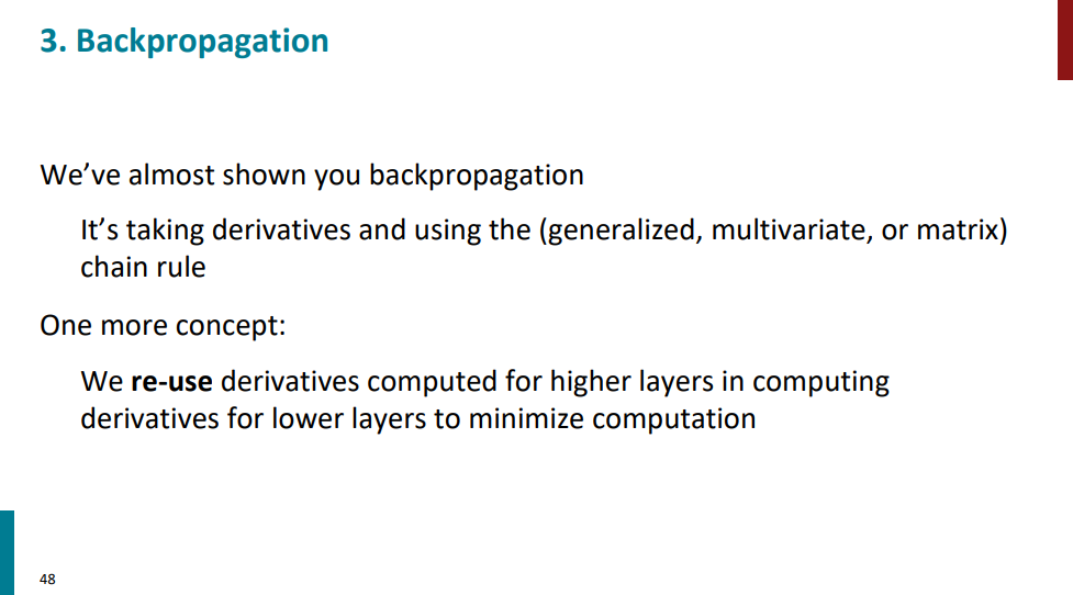 تا به اینجای کار یه جورایی با این الگوریتم آشنا شدیم. ایدهش اینکه بیاد مشتقها و گرادیانهایی رو که تو لایههای بالاتر گرفتیم نگه داره و بعد تو لایههای پایینی اگه دوباره نیاز به اون مقادیر داشتیم از همونا مجدد استفاده کنه، به جای اینکه بیاد دوباره از اول مشتق حساب کنه. یه جورایی سرعت انجام کار رو با کمتر کردن تعداد محاسبات بیشتر میکنه. در ادامه جزییات بیشتری ازش رو میبینیم.