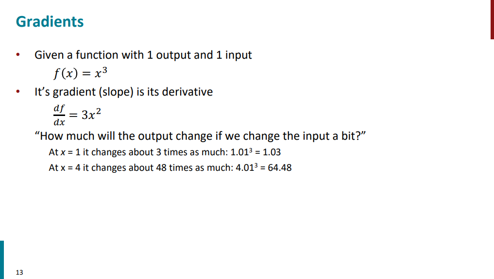 تو همین مثال ساده اگه ورودی تابع 1 باشه، گرادیان میشه 3. این یعنی اگه ورودی رو نسبت به 1 یه ذره تغییر بدیم (مثلاً 1.01 در نظر بگیریم)، خروجی از 1 میشه حدود 1.03. یعنی تغییر خروجی تقریباً 3 برابر تغییر ورودی بوده (0.03 در برابر 0.01). ولی وقتی ورودی تابع 4 باشه، گرادیان برابر میشه با 48. این یعنی اگه ورودی رو نسبت به 4 یه ذره تغییر بدیم (مثلاً 4.01 در نظر بگیریم)، خروجی از 64 میشه حدود 64.48. یعنی تغییر خروجی تقریباً 48 برابر تغییر ورودی بوده (0.48 در برابر 0.01).