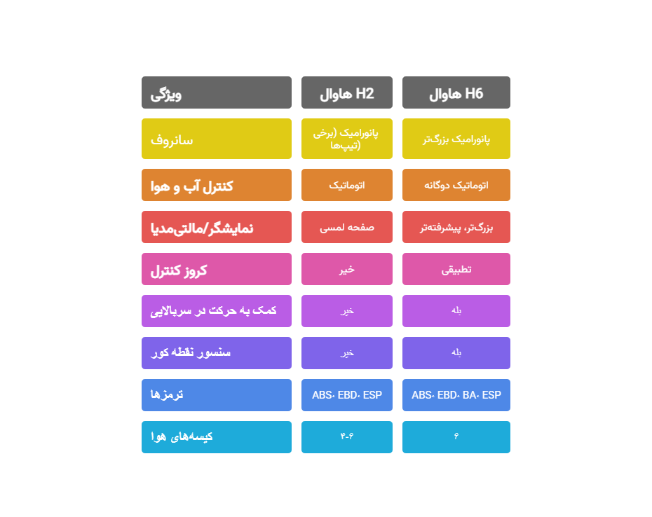 امکاناتهاوال H2هاوال H6سانروفدارد (پانوراما)دارد (بزرگتر)تهویهاتوماتیک سادهدوگانه اتوماتیکنمایشگرلمسی سادهلمسی پیشرفتهترایمنی الکترونیکیABS، EBD، ESPABS، EBD، BA، ESPکیسه هوا۴ تا ۶۶ (کاملتر)کروز کنترلندارددارد (تطبیقی)