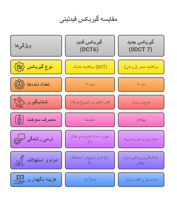 وقتی صحبت از انتخاب بین نسخه قدیم و جدید فیدلیتی میشود، خریدار بیشتر به دنبال درک تفاوتهای کلیدی این دو گیربکس است. در ادامه به صورت ساده و جامع این تفاوتها را بررسی میکنیم.