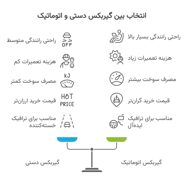 قیمت خرید بالاتر: خودروهای مجهز به گیربکس اتوماتیک معمولاً گرونتر از مدلهای دندهای هستن.