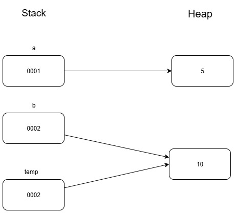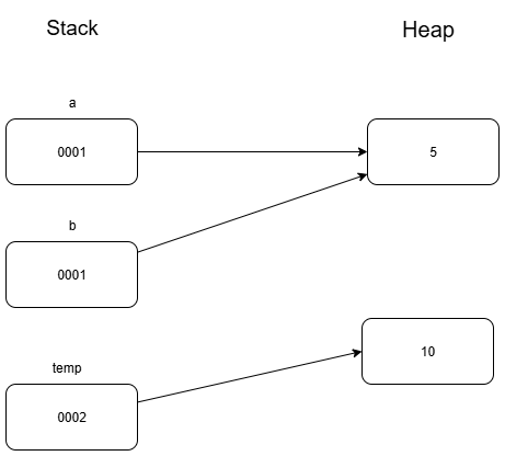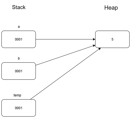 اینجا چه اتفاقی افتاد؟ متغیر a شد یه آبجکت جدید. b به آدرس حافظه a اشاره میکنه و فانکشن doSomething فراخوانی شد که در نتیجه یه کپی از آدرس حافظه متغیر a به فانکشن پاس داده شد. داخل فانکشن متغیر temp هم به کپی آدرس حافظه a اشاره میکنه. هر تغییری که توی فیلدهای temp بدیم روی آبجکت اصلی اعمال میشه.