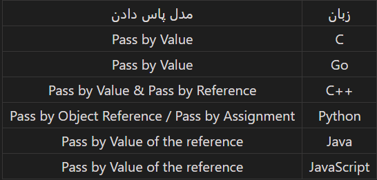 همیشه این مفهوم Argument Passing در زبان های مختلف برام گیج کننده بود و جالبه که از زبانی به زبانی دیگه تفاوت داره. اینجا اومدیم برای بیشتر زبان های رایج بررسیش کردیم و در نهایت توی یه جدول خلاصشو نوشتیم. یک بار برای همیشه!