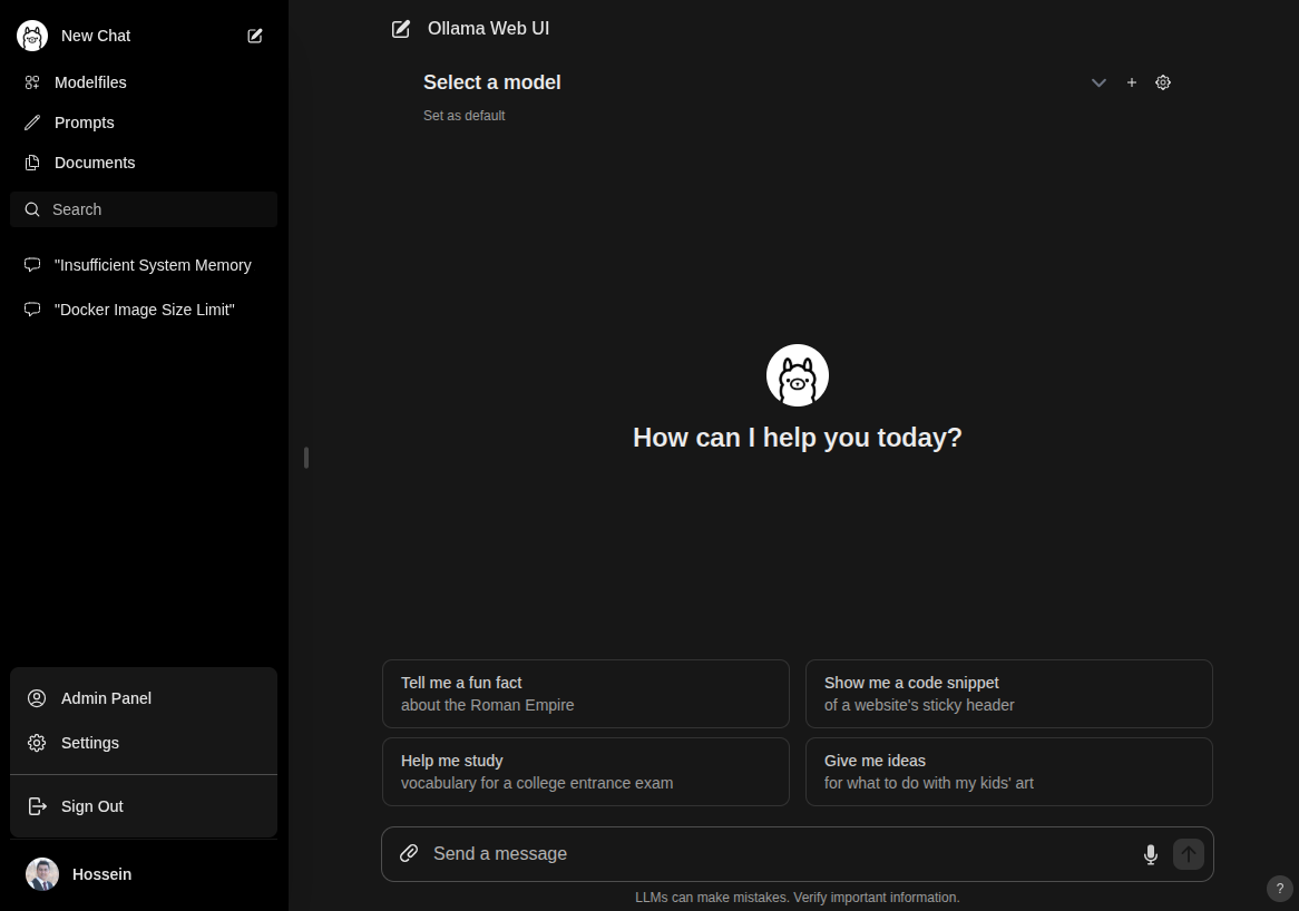 بعدش برو تو لینک webui که همون لوکال هاست هست روی سلکت باکس select a model بزن و LLMای که پول کردی تو لیست میاد: (با سیستم نتونستم اسکرین شات بگیرم لیستش رو تا دکمه پرینت اسکرین میزدم میرفت :) با موبایل گرفتم).
