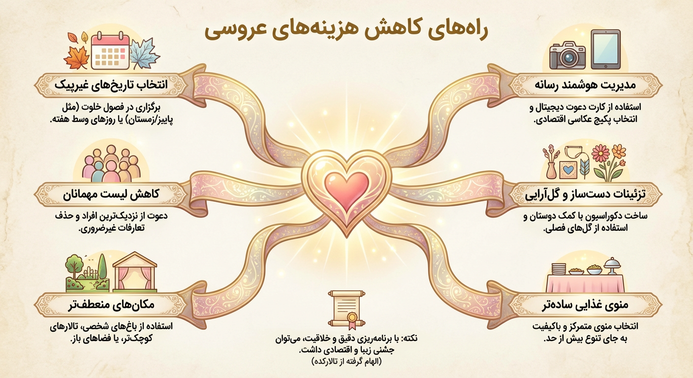 این تغییر زمانبندی نه تنها هزینه اجاره و تشریفات را کاهش میدهد، بلکه به شما امکان میدهد تأمین کنندگان بهتر یا گزینه هایی که در روزهای شلوغ در دسترس نیستند را با قیمت مناسبتر انتخاب کنید.