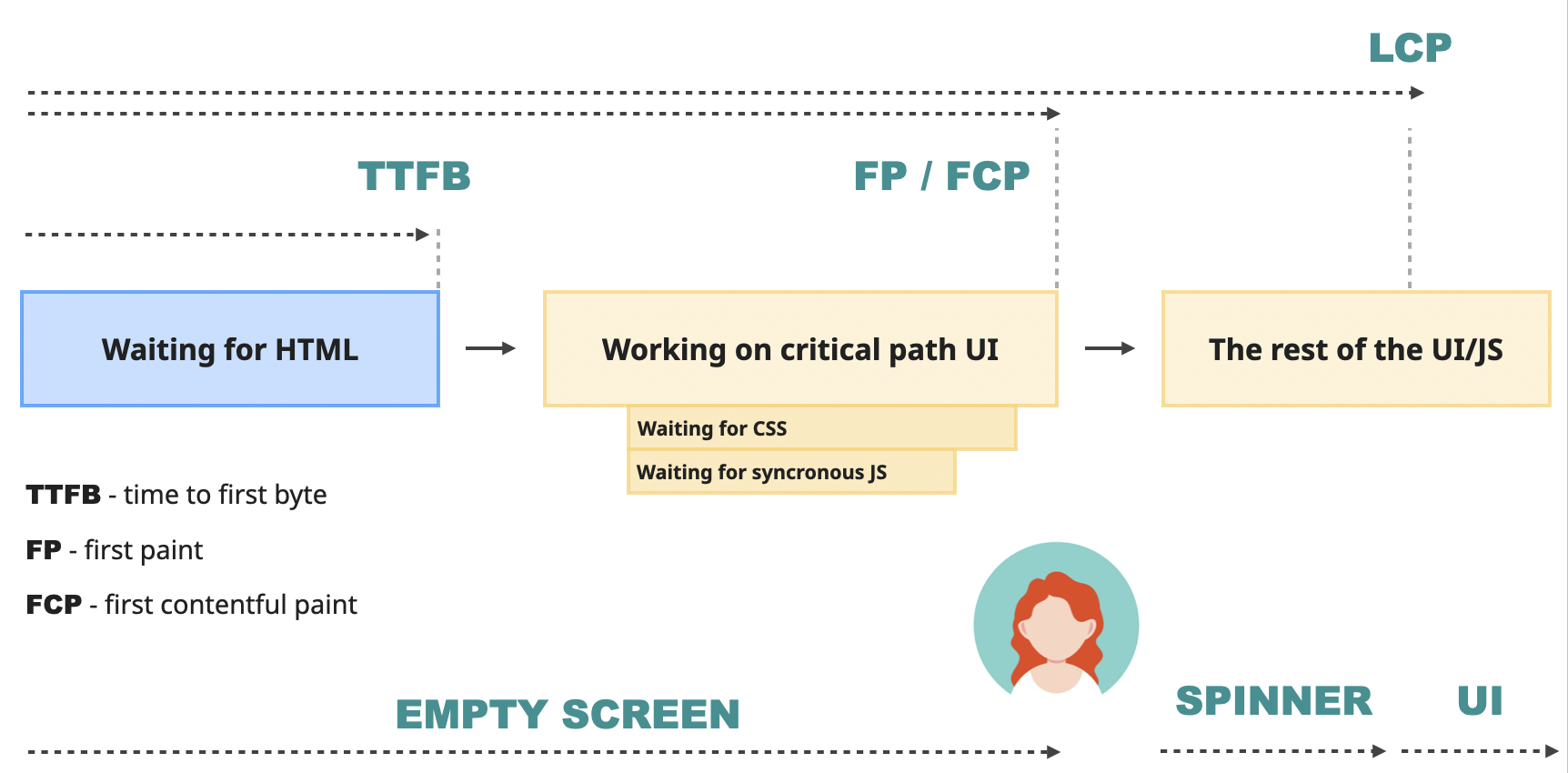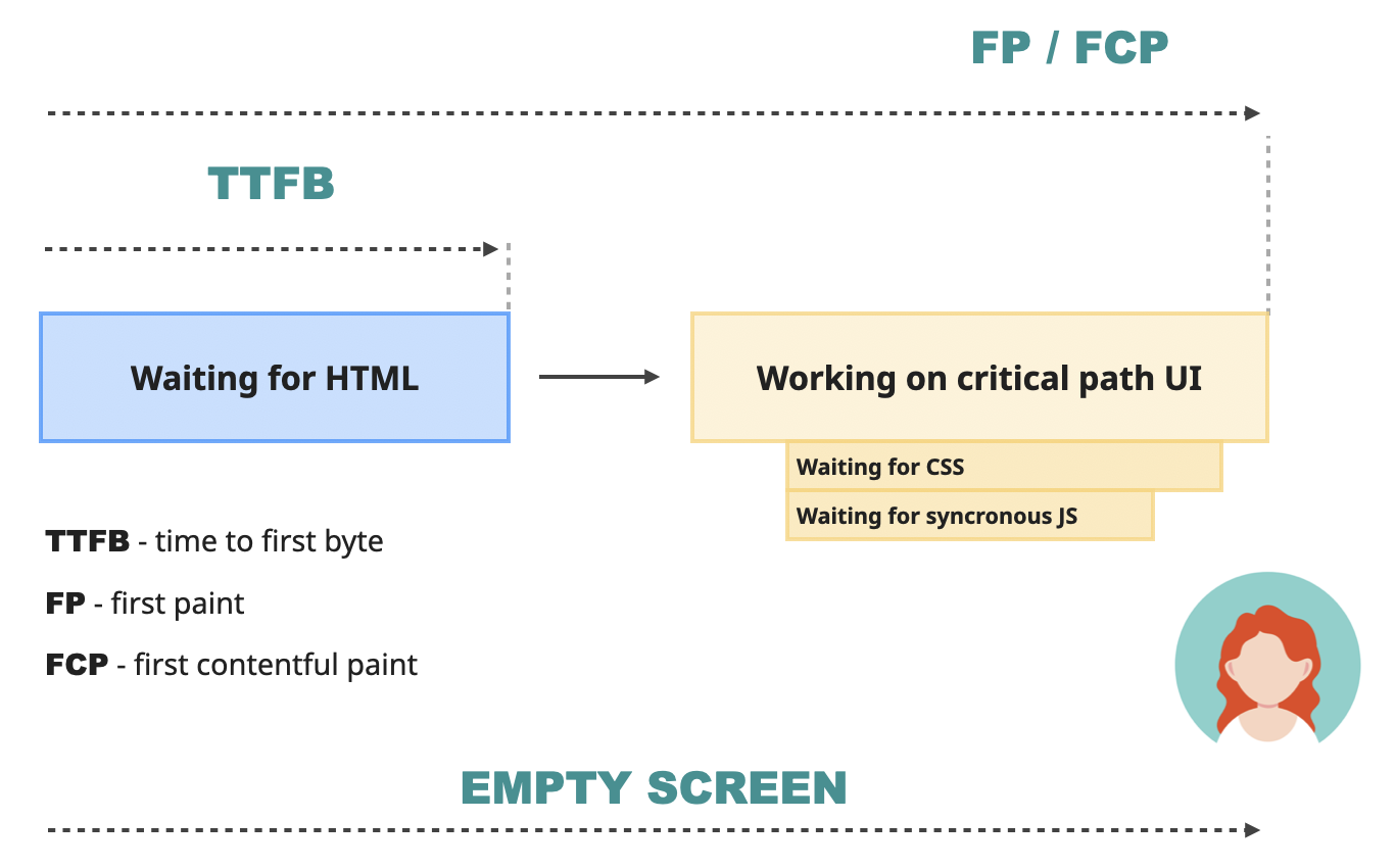 تا این لحظه، کاربرا فقط دارن به صفحهی خالی زل میزنن و معطل شدن! طبق گفتهی گوگل، یه عدد خوب برای FCP کمتر از ۱.۸ ثانیهست. اگه بیشتر از این طول بکشه، کاربرا کمکم علاقهشونو به اپلیکیشن از دست میدن و ممکنه صفحه رو ببندن و برن.